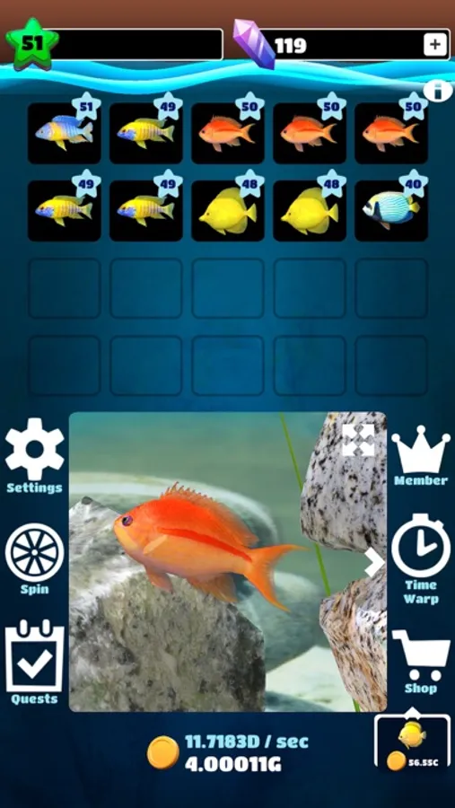 Click, Tap and Drag to Merge Fish. Upgrade fish to earn more Coins and unlock new species!