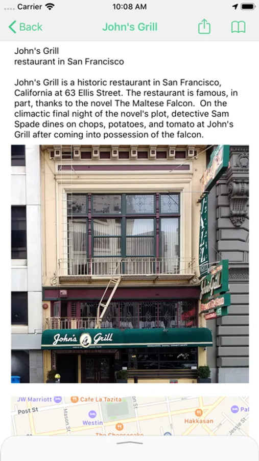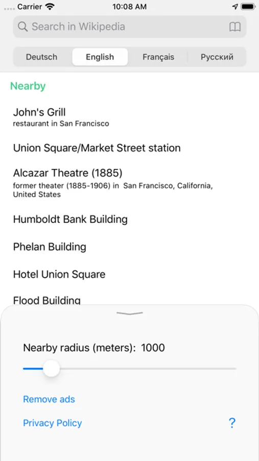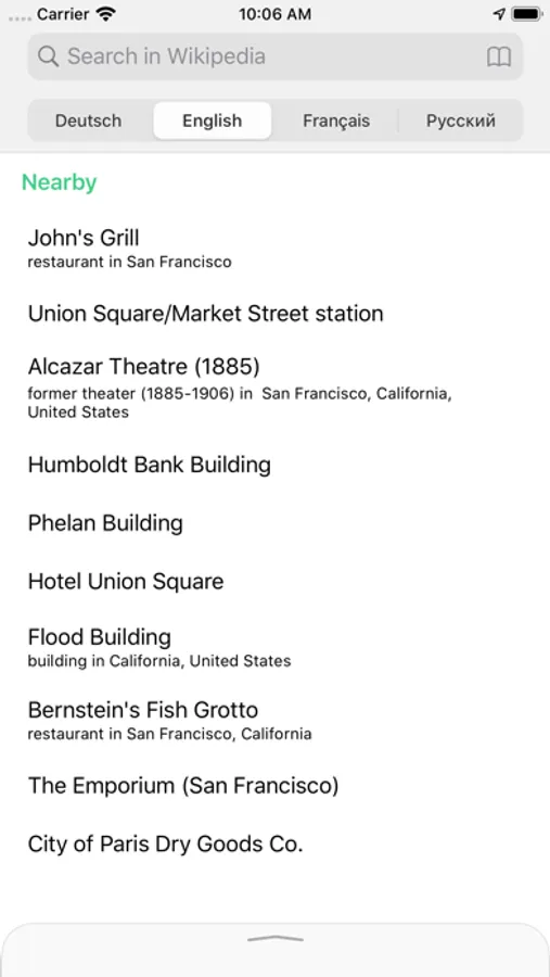 The app performs a quick search for articles on Wikipedia by words or near your current location. The search mode changes depending on characters in the search string. You can interactively change the radius of search by location in the drawer at the bottom of the screen. The number of articles in different languages varies so the search is carried out with the language taken into account. The number of available language switches is determined by the languages enabled on the device. Enable additional languages in the Settings while travelling. Each article can go with a photo and a map if it is tagged to a location.