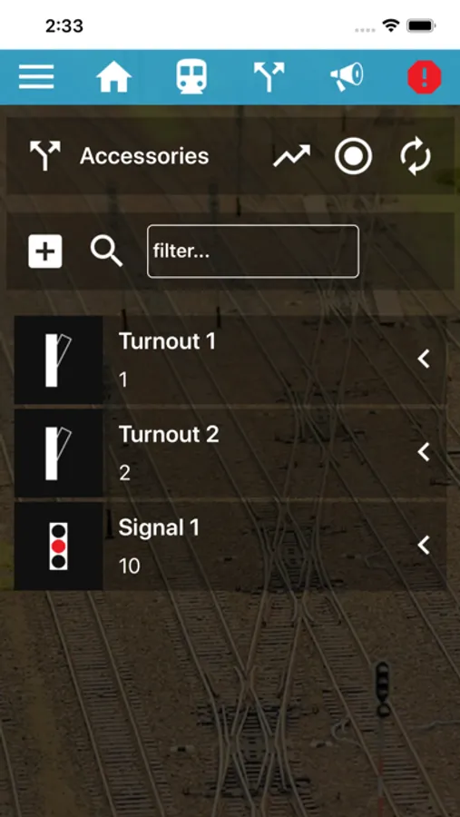 You can add your accessories (turnouts, signals, lamps, etc.) to the app and control them individually. You can also make routes, add signals to see block occupancy and create unique dependency logic commands.