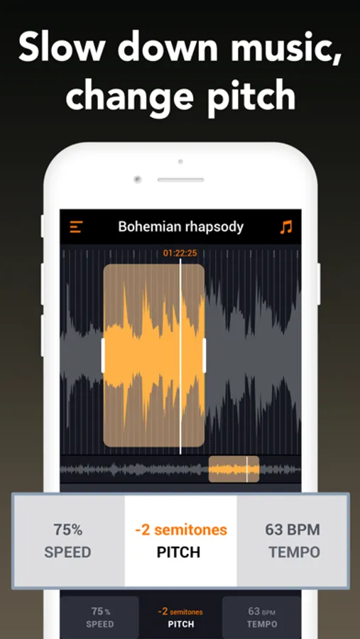 • Slow down audio. Hear specific notes and focus on certain parts of a song.