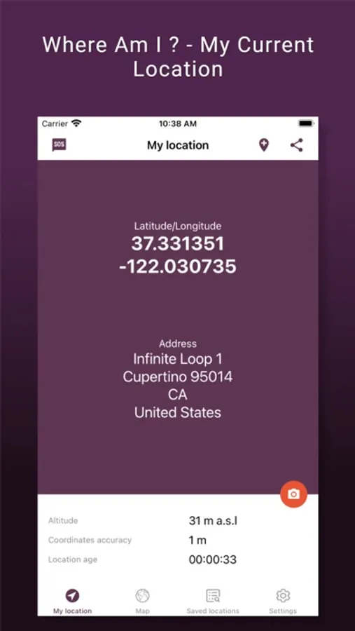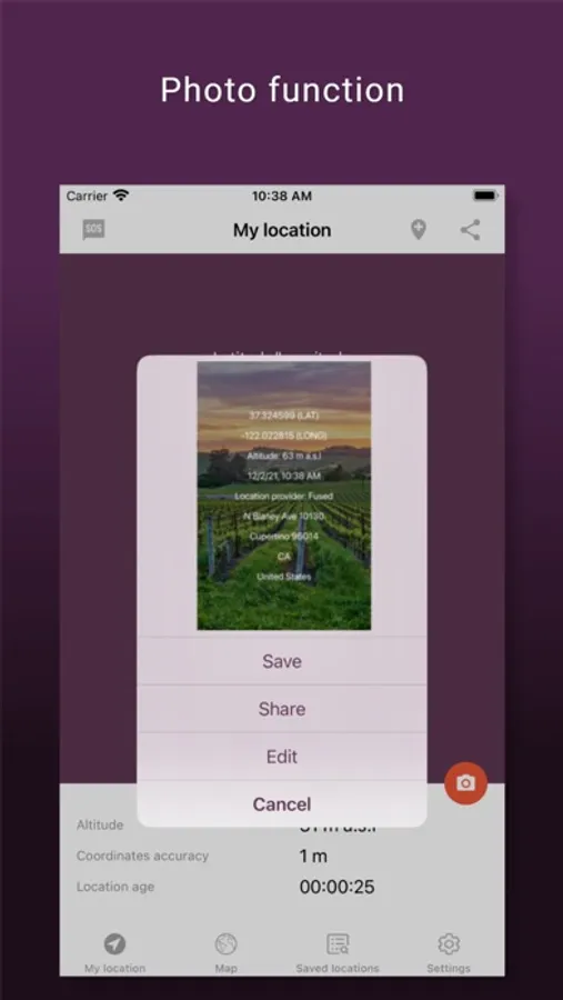 In addition, on the main view screen, you can save your exact location and take a photo and our application will plot any data you wish on it.