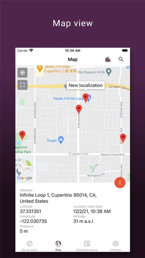 In the map view, you can see your current position and saved locations as well as add new places. Thanks to this function, you can easily find beautiful beaches from last summer, hidden treasures, favorite restaurants or even a place to park your car. To add a new place, just press and hold a button and then enter the name. You can switch to four different map types - normal, terrain, hybrid, satellite. In this view, a coordinates finder is available based on your current address - all you need to do is enter the address and the application will determine the location data, such as latitude and longitude or vice versa.