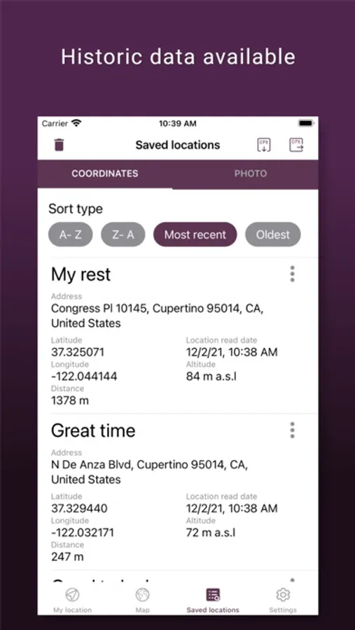 On the history screen you will see all of your saved places. A chronological sorting is also available, in alphabetical order, based on distance from your current location. The application displays the name of the place, save date, latitude and longitude, distance from current position based on WGS84, direction and saved photos. An interesting feature is the possibility of transferring a given place to another person using our application and the import / export function.