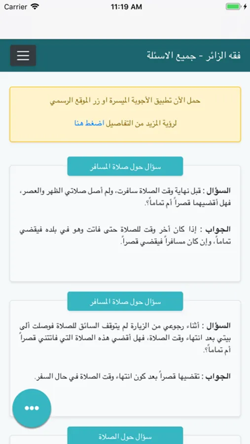 تشمل عرض الاسئلة والاجوبة الفقهية الخاصة بالزائر حسب مواضيعها.