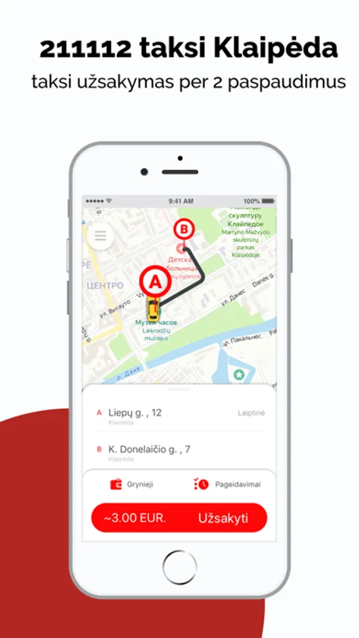 - Šiuolaikinis programėlės dizainas pagreitina ir supaprastina taksi užsakymo paslaugą. Pasirinkite vieną iš ankstesnių adresų tiesiog pradžios ekrane.