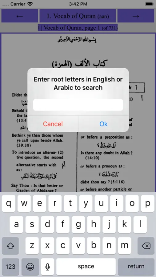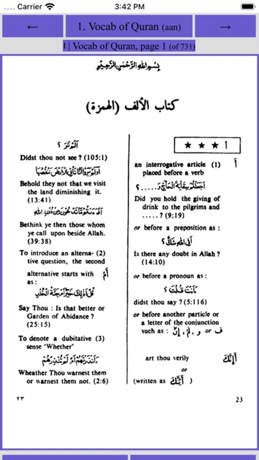Qamus Alfaz is the digital version of "The Vocabulary of the Holy Quran" (Qamus Alfaz al Qur'an al Karim), compiled by Dr Abdullah Ali al-Nadwi. You can search through the dictionary by using the root letter of the word and the app will display the corresponding page from the dictionary.