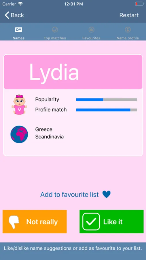 - Like or dislike names and feed the algorithm with better data to find better matching names