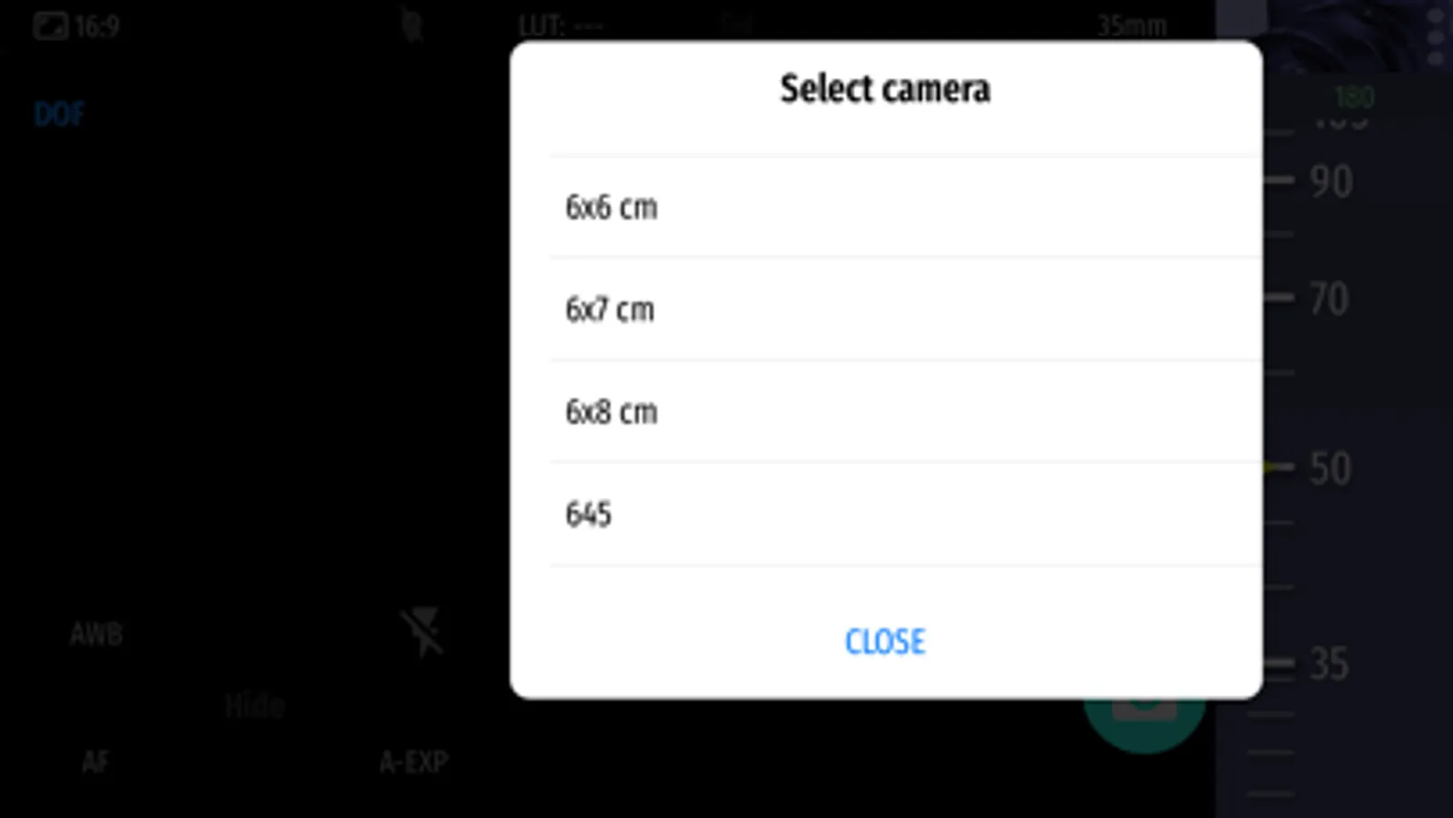 The app is a digital directors viewfinder - it helps you see the exact field of view for your future shot. Select the camera from the menu and rotate the wheel to select the focal length of the lens.