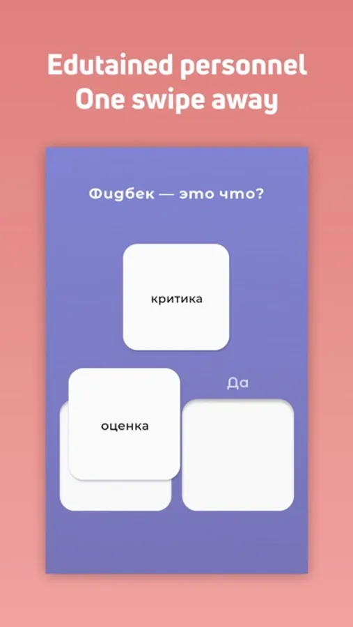 Swipe is a micro-training methodology for adults. Information is provided clearly and in manageable amounts in the format of short lessons lasting up to 10 minutes. Lessons consist of different types of cards: theory, micro-tests, sorting, ranking, audio files and videos. Instead of boring theory, it's a real story. The employee lives the story and improves his knowledge. The app is intuitive and tailored to the user's habits.