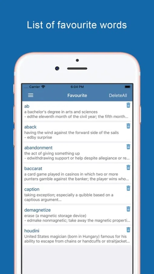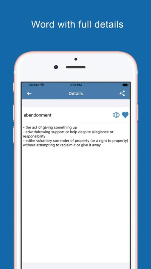 - Want to save a word meaning in the favourites? Tap the heart button and we will add this word automatically in your favourites. You can easily access to it anytime within the favourites choice in the options menu.