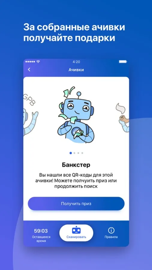 После сбора всех QR-кодов одного уровня (Hello GPB, Исследователь) возвращайтесь к стенду Банка и получите свою награду! Сканировать QR-коды можно в течение часа, после нажатия кнопки Старт в приложении.