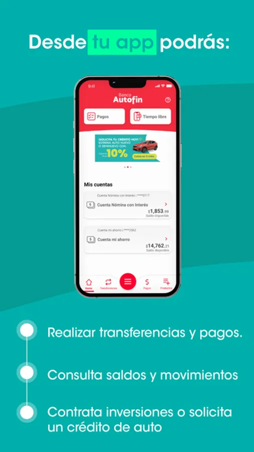 En Banco Autofin México Móvil te ofrecemos una experiencia intuitiva que cubre tus principales necesidades, ya que cuenta con una interfaz amigable y accesible que te permitirá realizar tus operaciones sin la necesidad de acudir a una sucursal.