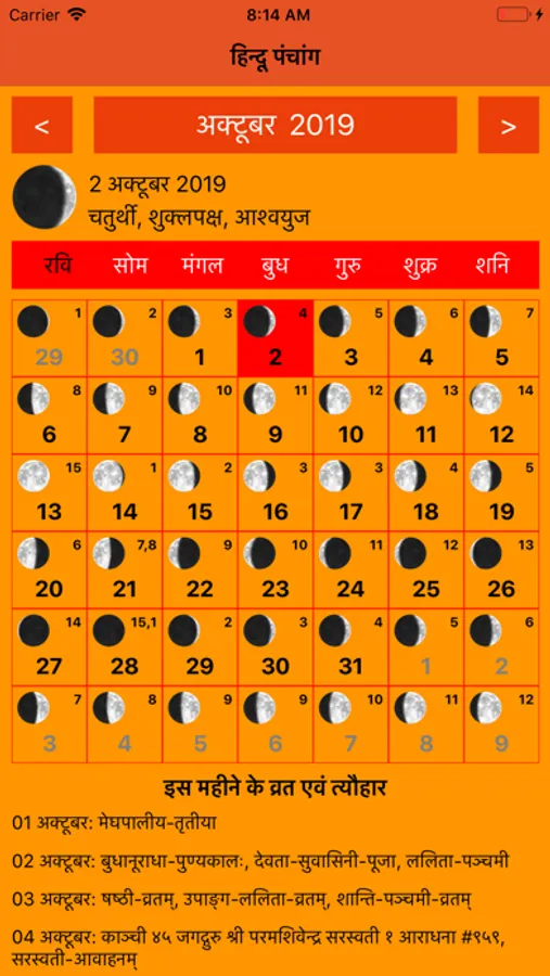 • A monthly Calendar view highlighting the Ekadashi, Chathurthi, Poornima and Amavasya. Shows the monthly list of festival. Also showing the moon phase for each date.