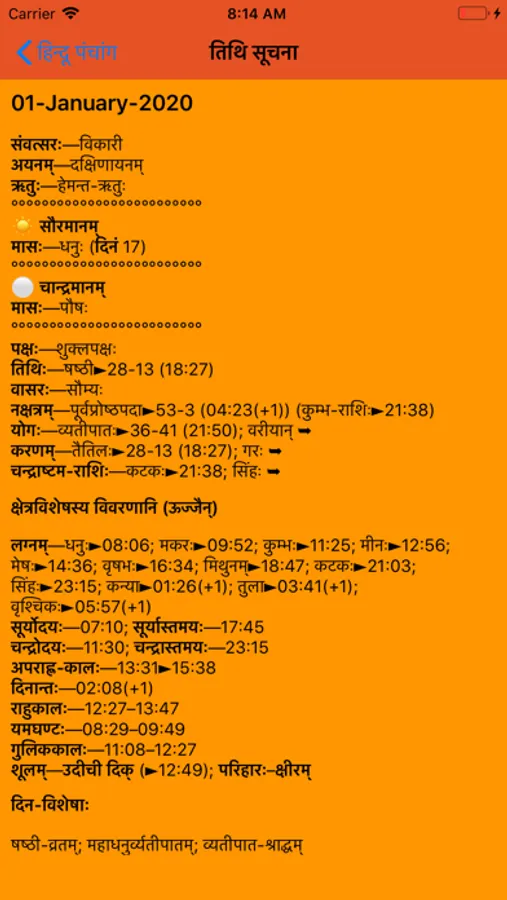 • Also shows varsh (Year), maah (month purnimant and amavasyant), zodiac of moon, ayana (Dakshinayan and Uttarayan) and the ritu (Season), along with their end times.