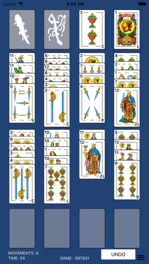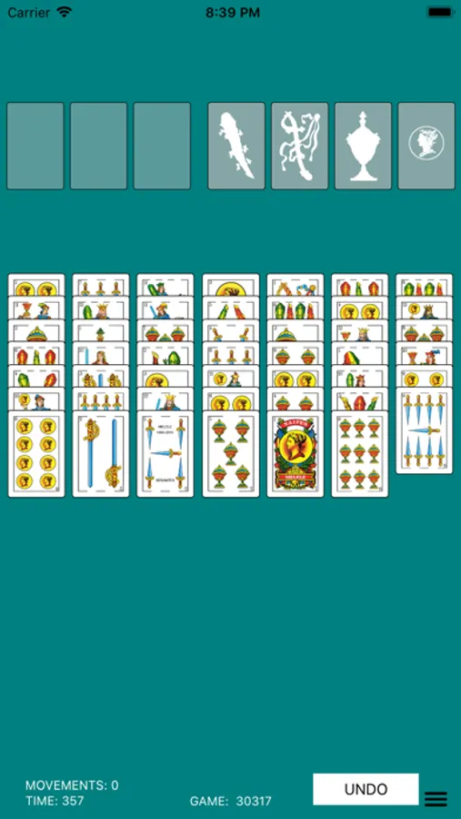 - After shuffling, seven or eight piles of cards are laid and all cards are visible. Partial or complete piles can be moved if they are built down by different suits