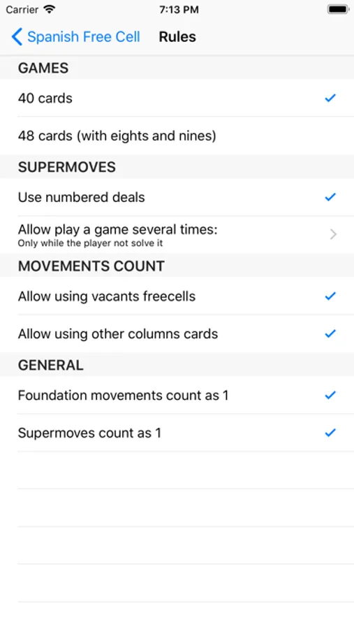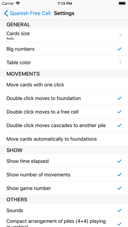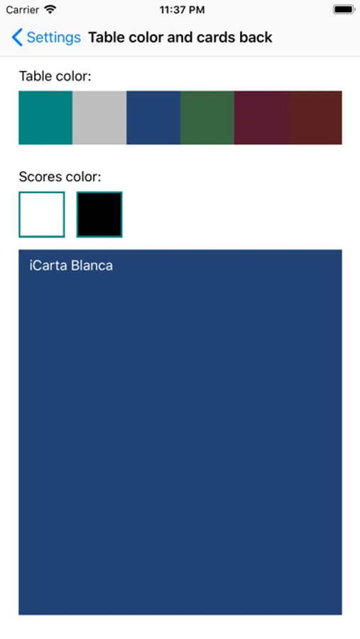 - Settings: Cards size and resolution, sound, scoreboards, table color, scores color, cards movements (only one click, doble click,...), cards numbers size,...