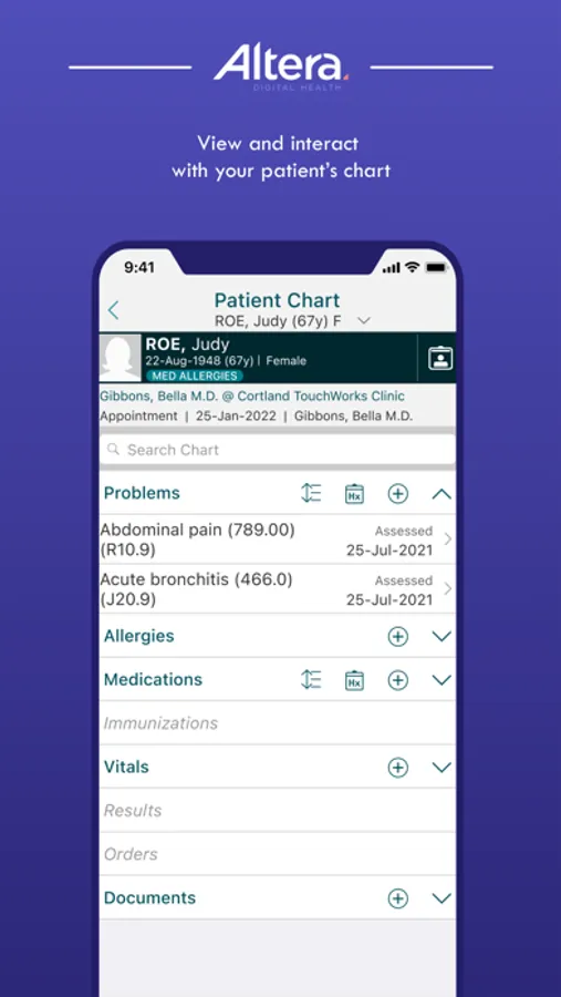 - View patient results, orders, documents, vitals, problems, history, medications, allergies, and immunizations