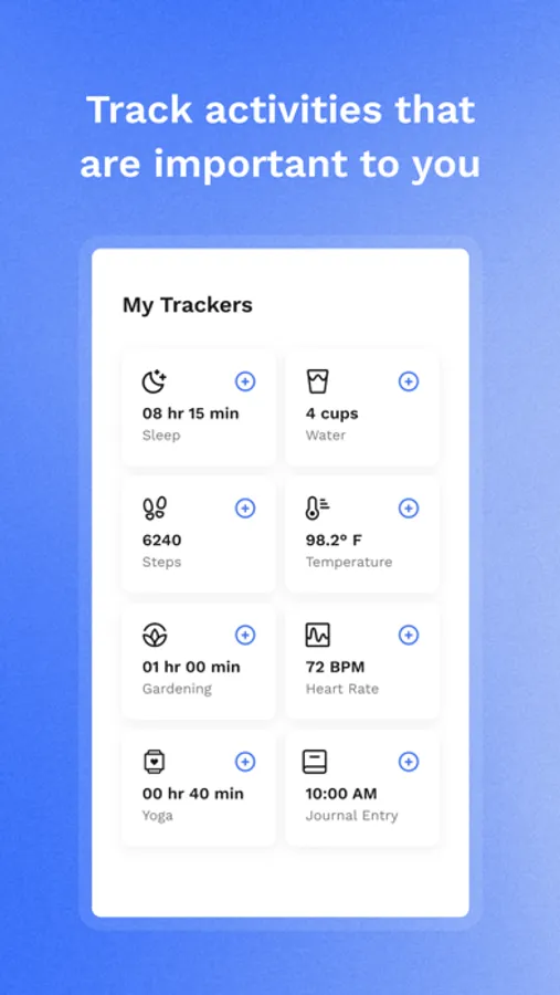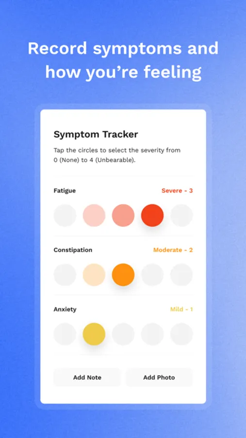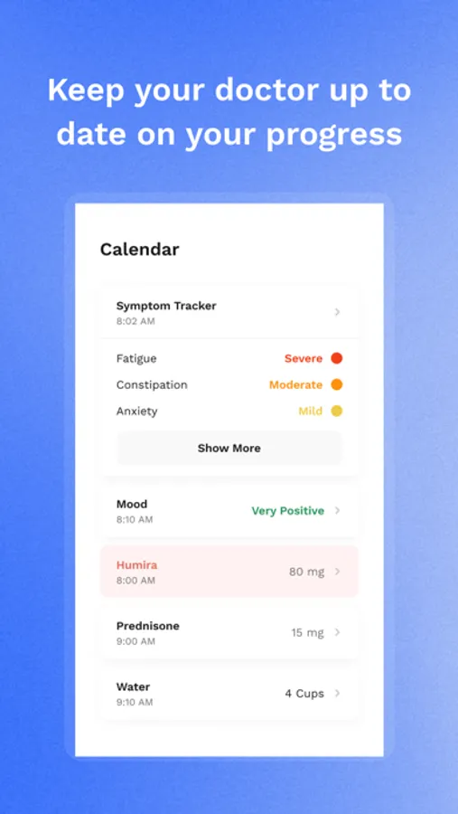 Track anything related to your condition all in one place: sleep, water, moods, physical activity, mindfulness, journal entries, and more. Record important treatment information like medications, symptoms, appointments, and hospital contacts.