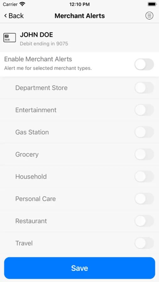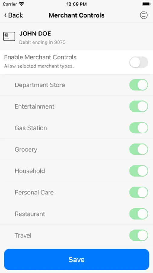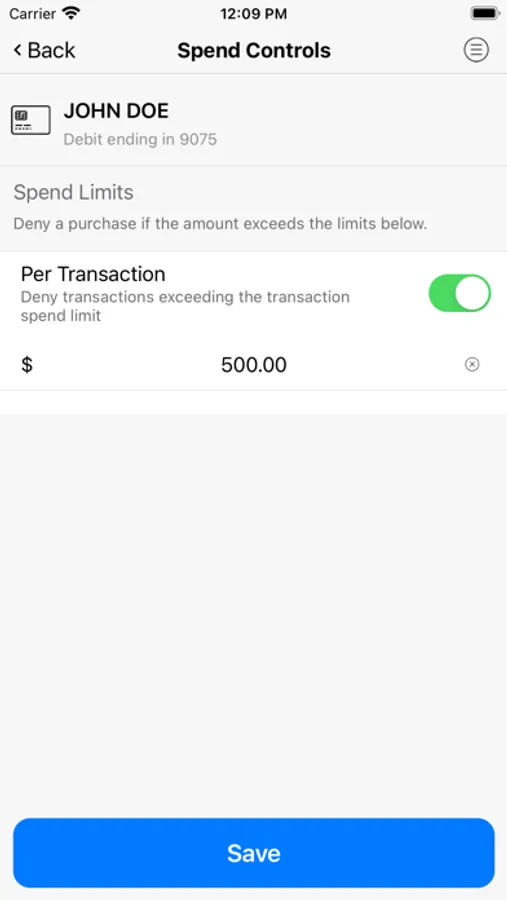 Set spending limits to decline transactions above your thresholds. Monitor activity by category such as gas stations and restaurants, and by type: in-store purchases, e-commerce transactions and ATM transactions.