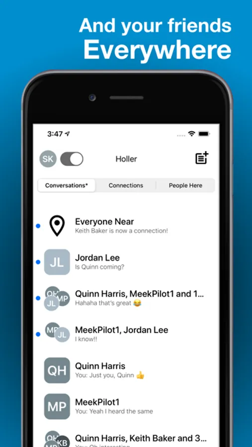 Holler puts you into instant contact with the people here now - safely and securely. Share messages, links, content and more with a single tap. Oh, and it will handle all your other messaging needs too. Easy. Simple. Holler.