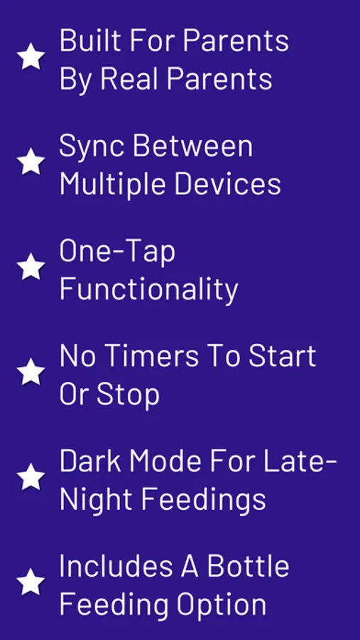 There are no timers to remember to start or stop, no complicated features that make the app hard to use. No in-app payments, no ads, just an app that works. As a mom with a newborn, you are already tired enough and don't want to spend too much time fiddling with unnecessary options and features. You just want to know when you last fed your baby, and which side the baby nursed from if you breastfeed (there is an option for bottle-fed babies). You can also synchronize all your data with multiple devices, including your partner's. All for free.