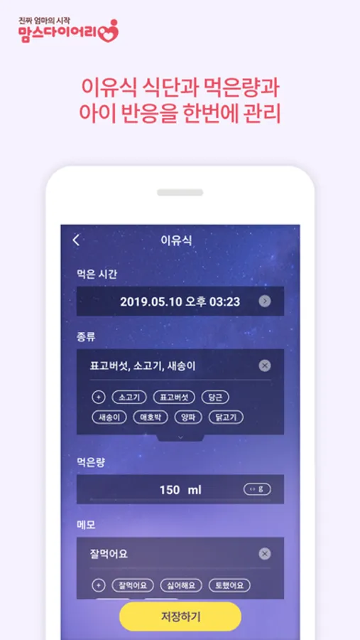 ㆍ 이유식 관리 (이유식 종류, 적은량, 반응 상태 기록 관리)