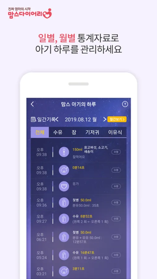 수유관리는 기본, 이유식관리 / 기저귀 체크 / 잠자기 기록까지 아기의 모든 관리를 『맘스 아기의 하루』에서 관리하세요.