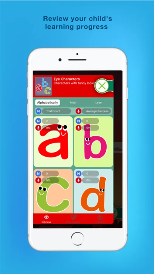 Parents may review their child's learning progress. The accumulated numbers of tries of each character are available so that it is very easy to verify that all characters have been tried, and that they are practiced about equally many times.