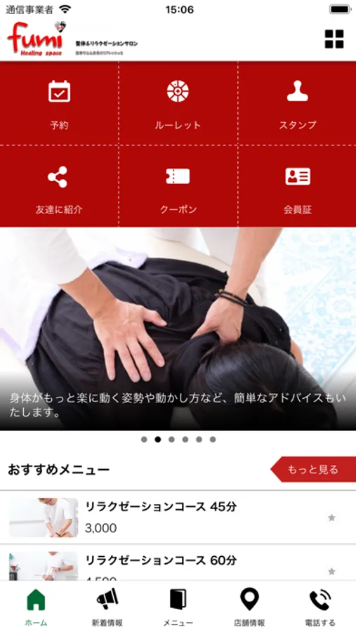 Healing space fumiの公式アプリが登場いたしました。いつでもお手元のスマートフォンから、メニューなどがご確認いただけご希望のお時間帯のチェック・ご予約などが可能です。
