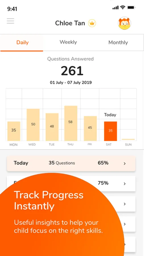 The app gives you a bird’s eye view of your child’s overall progress. It also allows you to zoom into the details, so you know exactly which skill to put more attention on.