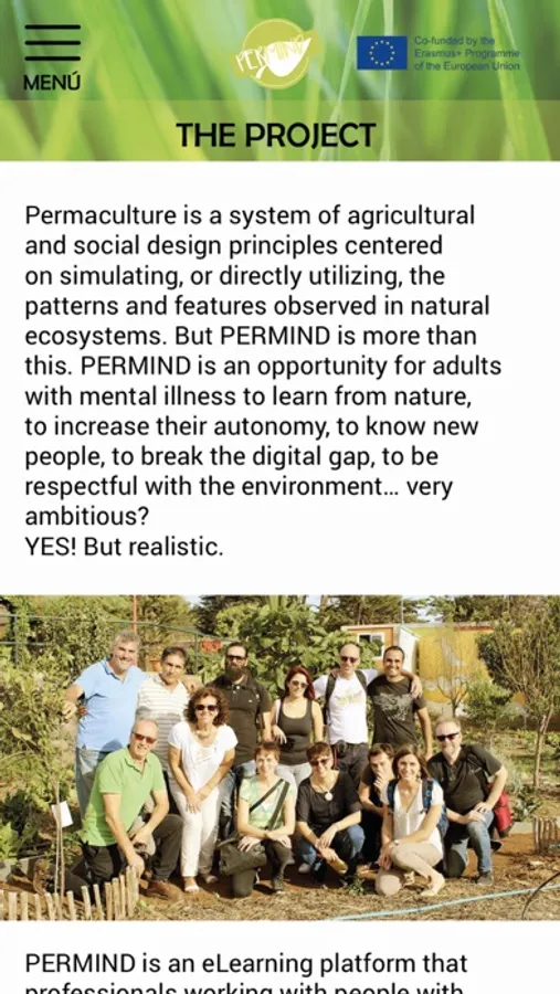 PERMIND is an eLearning platform that professionals working with people with severe and prolonged mental illness can use to learn how to create therapeutic gardens based on the principles of permaculture. In this platform you can find training sessions, tips, pieces of advice on how to establish a cooperative and good examples of the results that can be obtained. Everything related to PERMIND is made available through the digital learning platform.