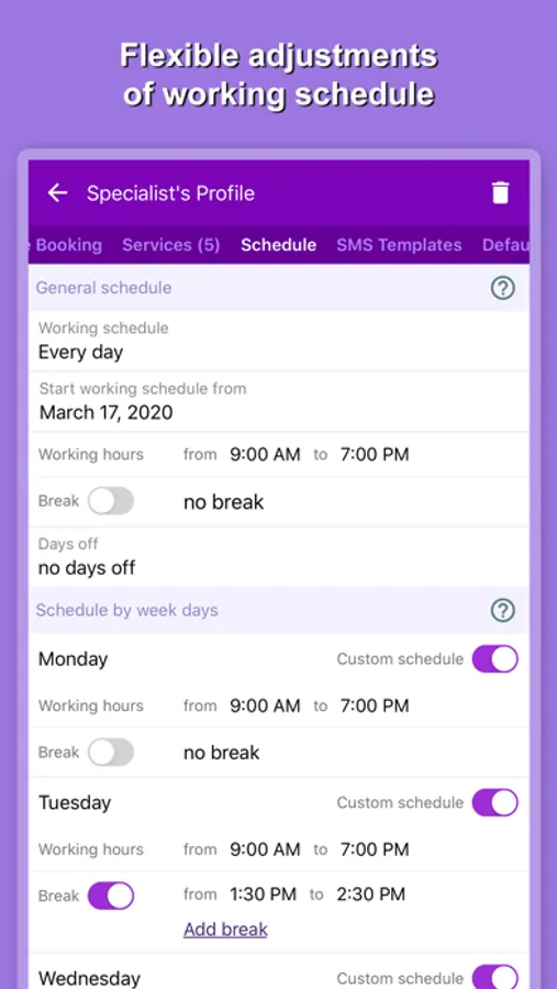 - Allows flexible setting of working schedule (you can even create a schedule for every day).