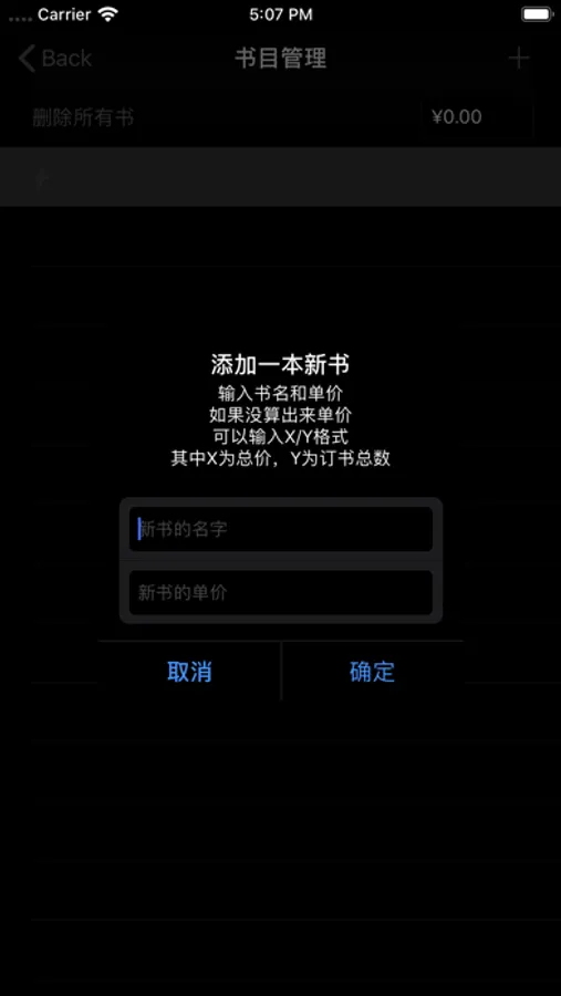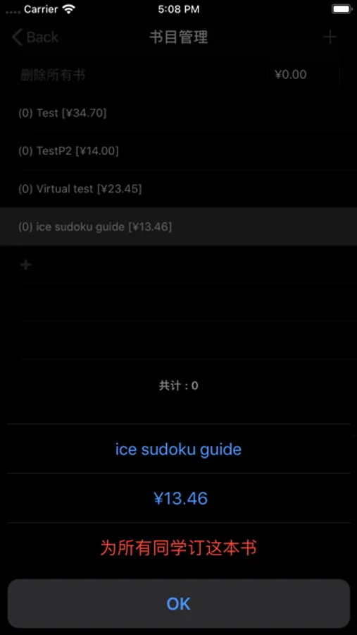 之后如果需要订书,切换到订书单列表,在书目管理里面点击加号就可以添加需要订的书的名称,价格可以选填,等到最终知道价格后再填也行(如果你需要最终计算价格统计表那么肯定要填单价了),在书目管理这边有给所有同学订书这一选项,一般只有毛概之类的书才需要用这个选项。