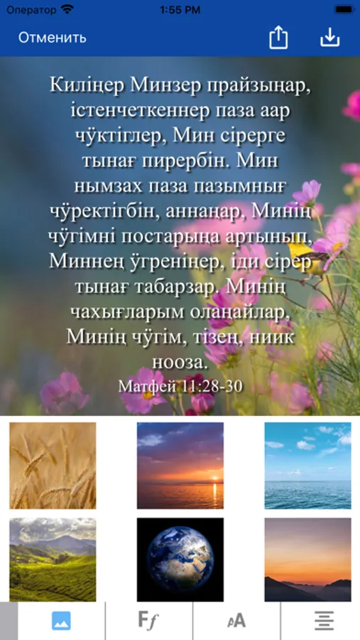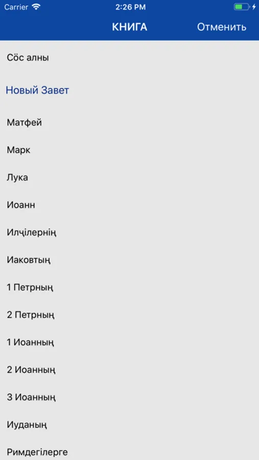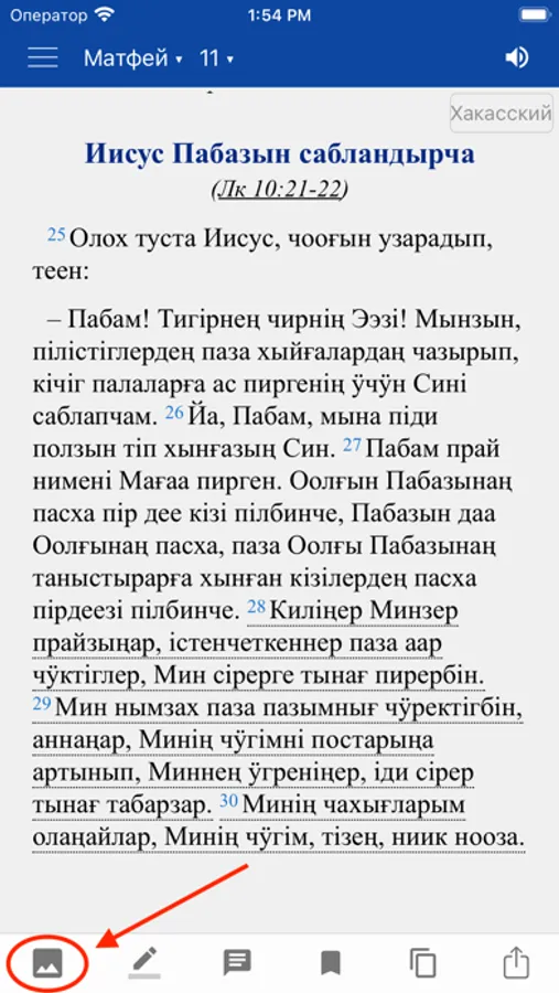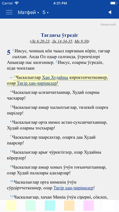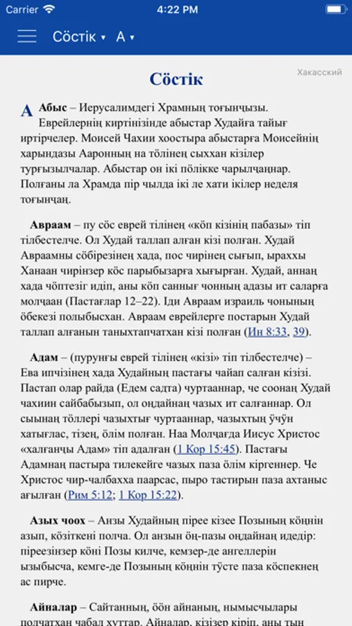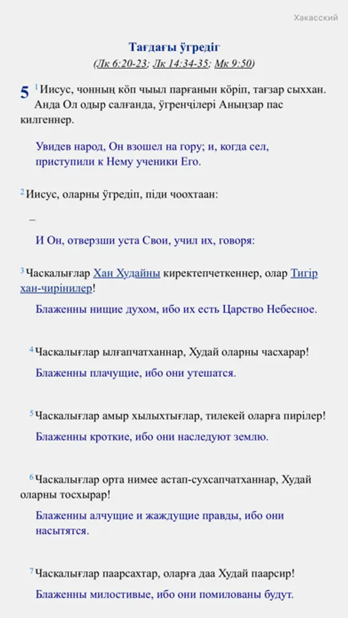 This application provides an opportunity to study the Scriptures. It contains both the Khakas translation and the Russian Synodal translation, which can optionally be displayed in parallel. Users can highlight verses in different colors, place bookmarks, write notes and view the reading history.