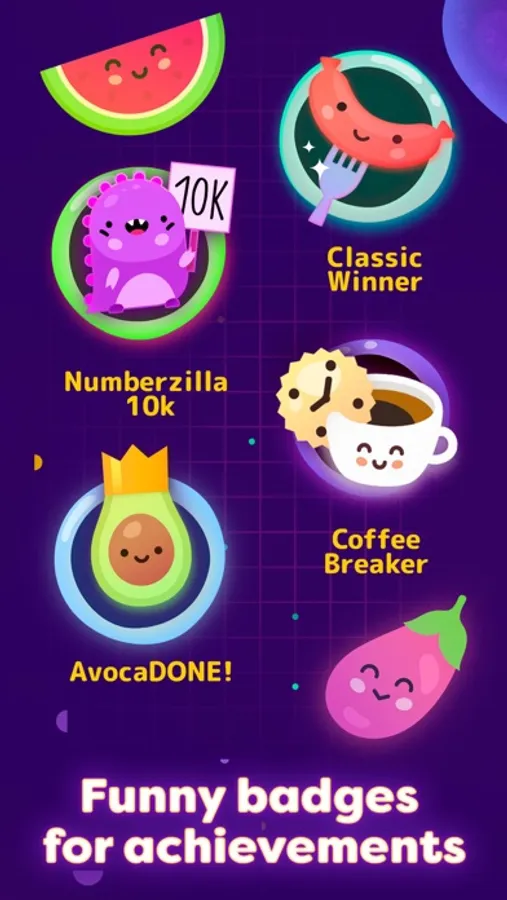 You will meet our cute mascot Numberzilla and friends - Smart Croissant, Sassy Avocado, Watermelon Warrior, and others. They will be happy to guide you through the rules and will keep track of your results and achievements.