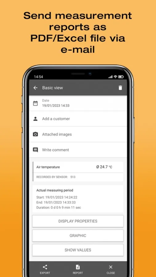 - Efficient: Create digital measurement reports including. photos as PDF/ CSV files on site and send them via e-mail.