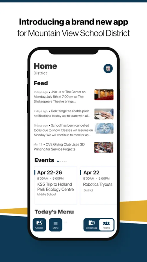 The event section shows a list of events throughout the district. Users can add an event to their calendar to share the event with friends and family with one tap.