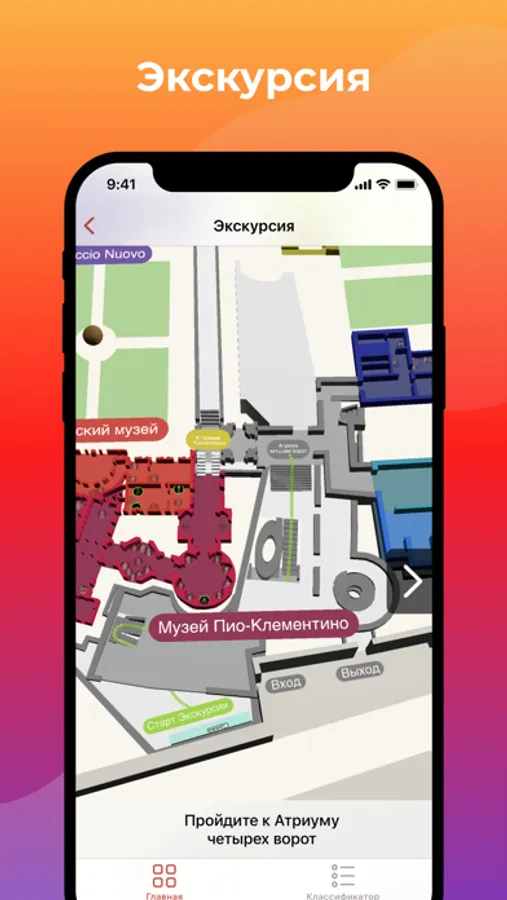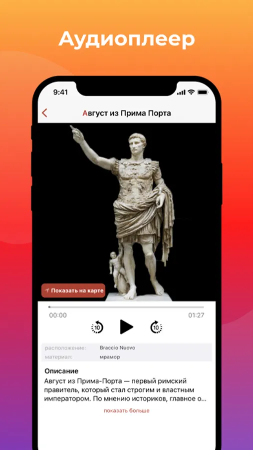 Удобная навигация по структурированным данным в формате аудиозаписи и текста. Функционал "Показать на карте" обозначит расположение коллекции или экспоната на модели музеев Ватикана.