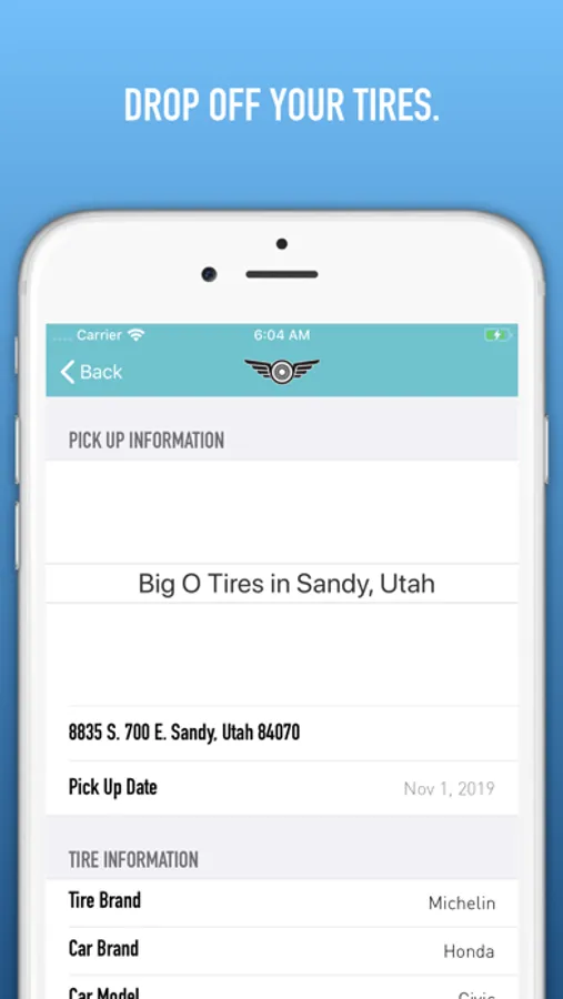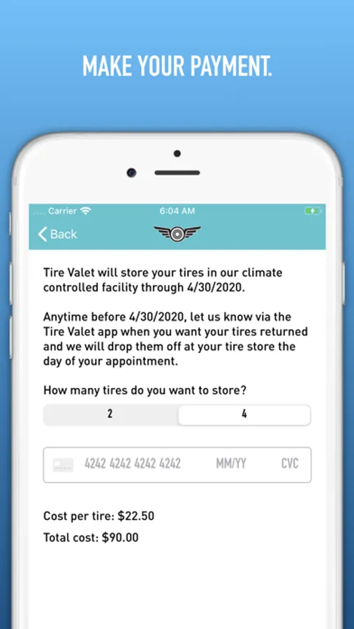 Tire Valet allows you to place your order in just a couple minutes all from your phone. Follow the simple steps to complete your profile, select your drop off location, complete your payment, and confirm your appointment. You'll get notifications when we pick up your tires, when they are placed in our secure warehouse, and when they are back in transit to your tire store on the date of your choosing.