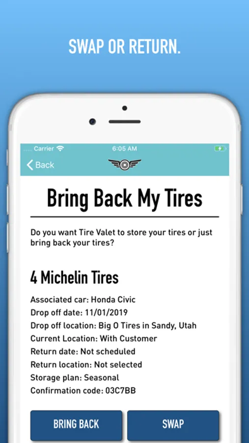 Tire Valet will pick up your tires at the designated tire store and deliver them to our storage facility. We require 24 hours notice of your desire to have your tires returned to your tire store. You can easily provide that notice via the Tire Valet app.