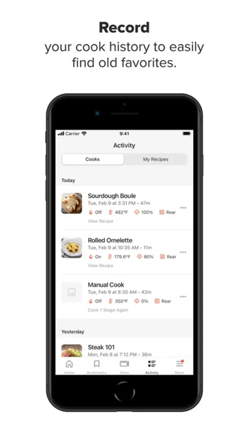 - View your cook history. It’s like having a DVR for your Oven — recipes and manual cooking sessions are automatically saved to your history, making it easy to revisit your favorites.