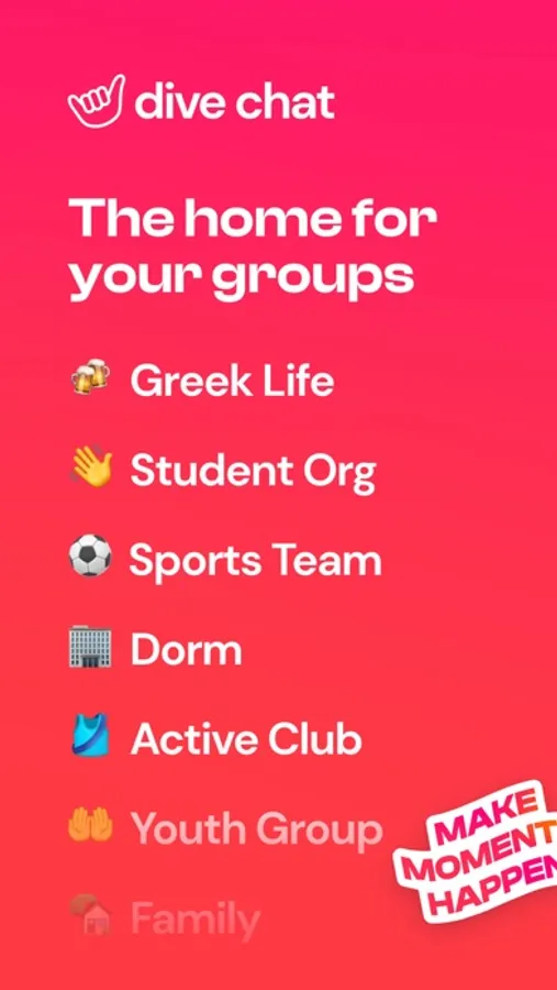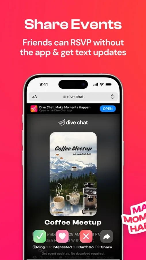 Create Dive Events that you can share with a link so that anyone can see the details and RSVP, even without downloading the app! Better yet, share events in your Dive Groups which are perfect for your friend group, active club, fraternity, sorority, student organization, or anyone you make memories with. MAKE MOMENTS HAPPEN.