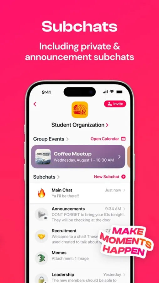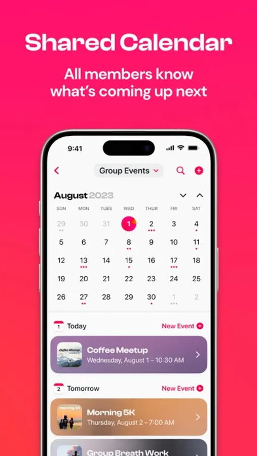 • Events happening in your group stay pinned to the top, right alongside your chats, so nobody misses them.