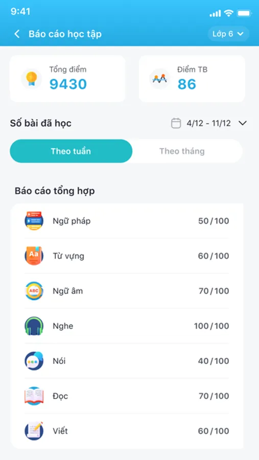 - Báo cáo kết quả học tập chi tiết của từng học sinh