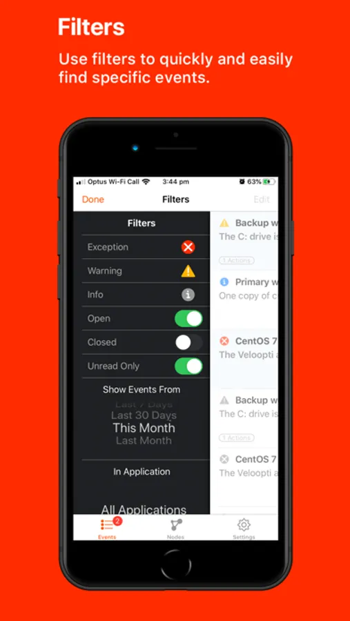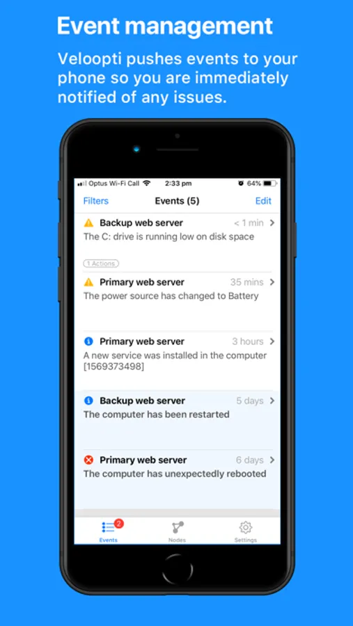 Ditch your email or SMS monitoring notifications by using the Veloopti app. Easily view new or open monitoring events right on your phone. Filter the events and hide the ones you aren't interested in.