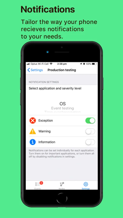 • Receive push notifications that are configured on a: per-organisation; per-application and per-severity basis