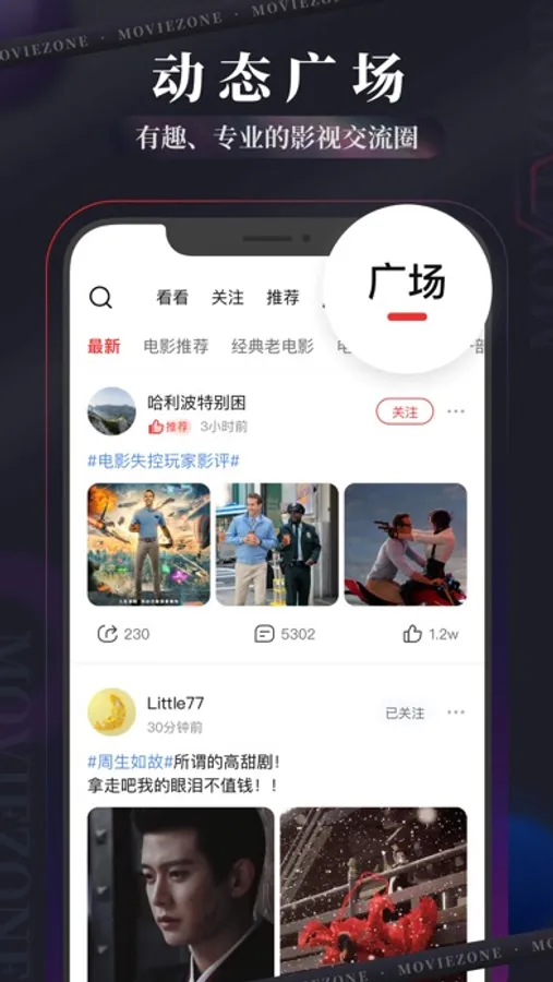 在动态广场中,可发布影评、影视娱乐信息、观影感受以及其他任何生活内容,还可以与众多影视爱好者们一起讨论,享受真实、有趣的社区体验。