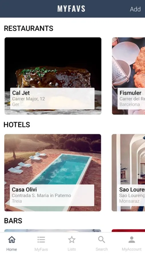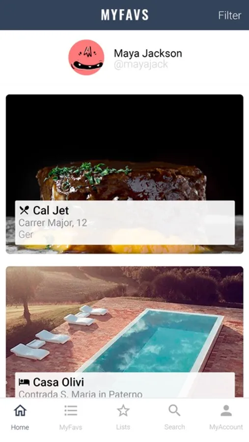 MyFavs is an application to save your hotspots in only one click! Build your own travel guide through an elegant interface and get access to all the restaurants, hotels, bars or coffees that you want to visit in your next trip or in your own city. Easy and quick access thanks to MyFavs. Also you can save in just one app all the places you liked and you do not want to forget to repeat some day with friends or someone special.
