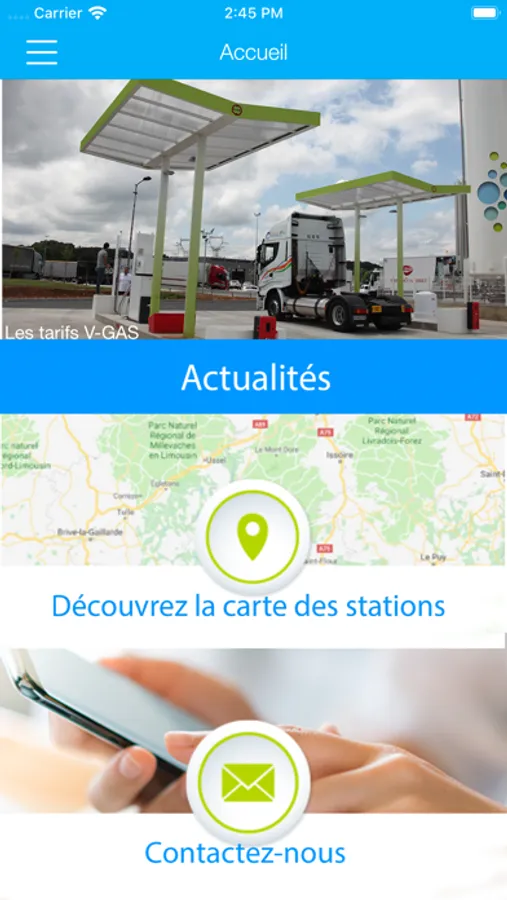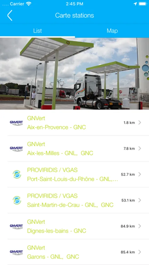 L'application V-GAS c'est avant tout la carte interactive de la filière GNV (Gaz naturel pour véhicule) en France. Développée à partir de l'open Data GrtGaz cette application a pour objectif d'offrir un service adapté aux chauffeurs et transporteurs désirant trouver la station GNL / GNC / BioGNC la plus proche de leur position et d'y trouver également des informations telles que l'adresse, le nombre de pompes disponibles, le ou les carburants disponibles ainsi que les spécificités propres à chaque station. Par ailleurs l'application donne l'actualité de l'entreprise Proviridis et de sa marque V-GAS.