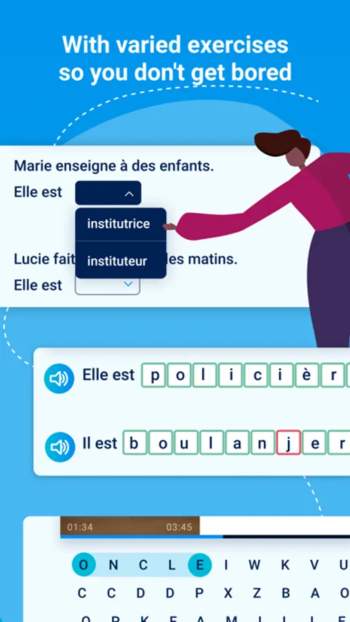 - The exercises are diverse so that you don’t get bored (multiple choice questions, crosswords, fill-in-the-blank texts, etc.),